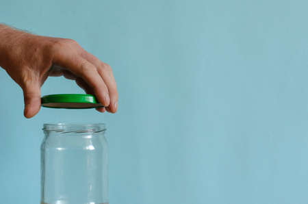 Hand closes an empty glass jar with a metallic green lid. Male hand over a glass jar. Middle-aged man of European race. Food packaging