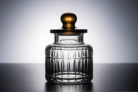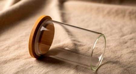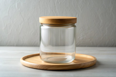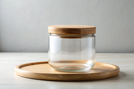 a clear glass container with a wooden lid sits on a textured surface in a softly lit indoor environment This image features a transparent background, making it versatile for various design projects.