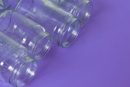 Transparent glass jars with lids isolated on purple background, top view flat lay recycling concept for environmental awareness. Segregated recyclables mock up conceptual idea, junk waste disposal