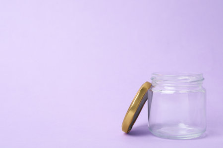 4 several glass jars on an isolated purple background with copyspace or blank empty room space for text or copy. Flat lay concept.