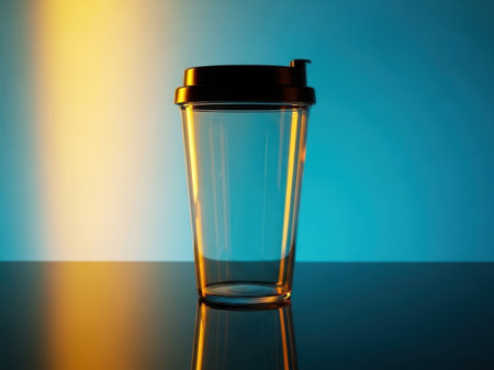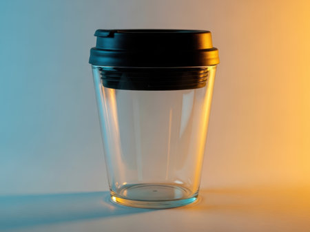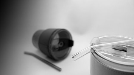 Tumbler in the form of a glass or glass mug with a modern design. Equipped with a beautiful lid and straw.