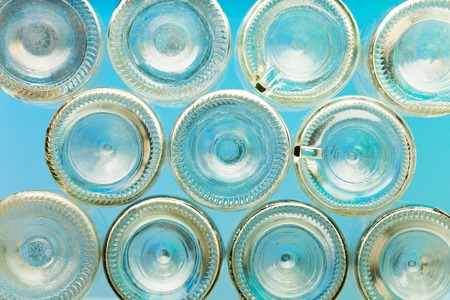Isolated open glass jars laid flat on blue background - blank empty room space room for text, copy, or center copyspace. Recycling program or campaign image with an assortment of top view containers.