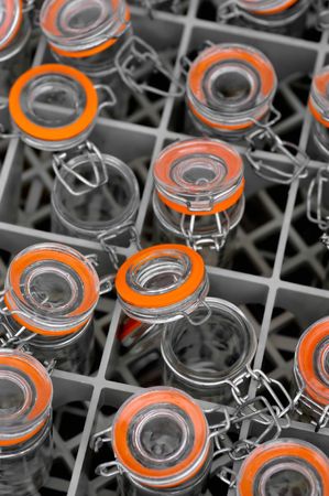 Glass containers for bulk products in rows with defocused background. Rhythmic composition of dishes close up