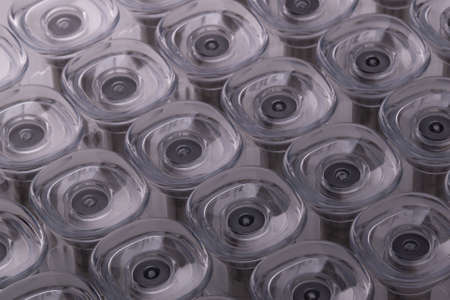 Abstract background of many empty glass of water placed on a table prepared for guests to dining in restaurant. Shallow depth of field in rows.