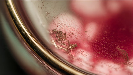 Close-up of a red liquid with gold dust particles, creating an abstract and textured background. Perfect for creative projects.