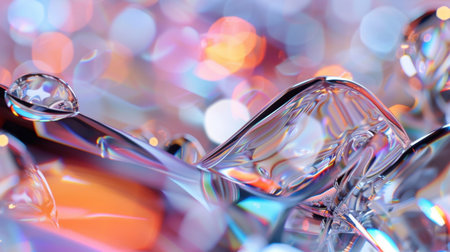 This captivating close-up image features colorful water droplets resting on a glass surface, complemented by a dreamy bokeh background that enhances the visual appeal.