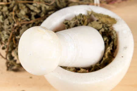 Mortar with dried herbs on table