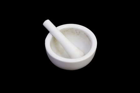 white porcelain mortar and pestle set on black background with cipping path
