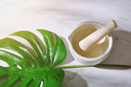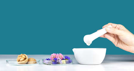 Alternative herbal medicine, Mortar with healing botanical herbs, Natural organic botany and scientific glassware, Natural skin care beauty products.