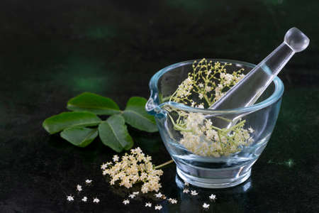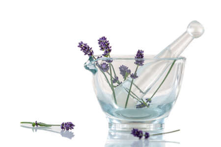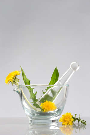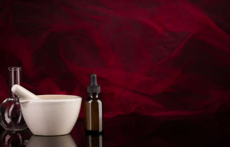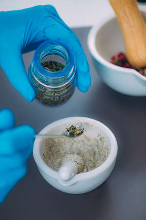 Natural organic medicine and healthcare, Alternative plant medicine, Mortar and herbal extraction in laboratory glassware.