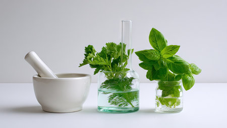The image showcases fresh green herbs inside laboratory glassware and a mortar and pestle. The composition features a clean white backdrop, highlighting the colors and textures of the elements. It suggests concepts of natural remedies, laboratory research, and could be used for health and wellness related content.