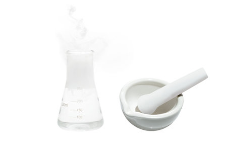 Chemist performs an experiment with liquid nitrogen in laboratory mortar with pestle