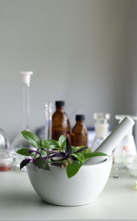 mortar and pestle with herbs in laboratory