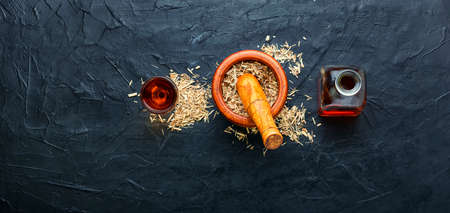 Medicinal tincture, plantain extracts. Medicinal herbs in herbal medicine. closeup,