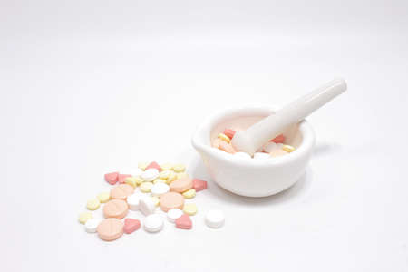 a set of Mortar. pestle and pills on white back ground