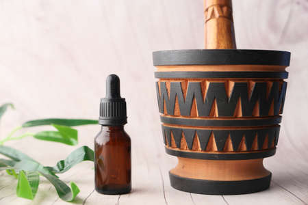 Natural remedy and wooden table background