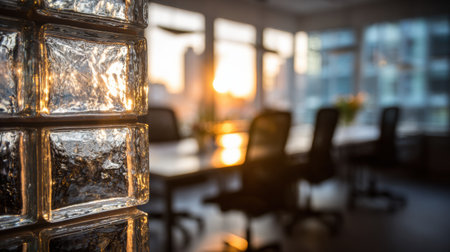 Sunlight shines through glass bricks in a room featuring office chairs and a welcoming atmosphere during sunset hours.