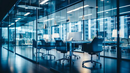 Abstract blurred interior of modern office with glass walls and meeting room.