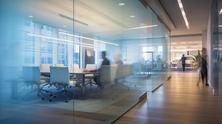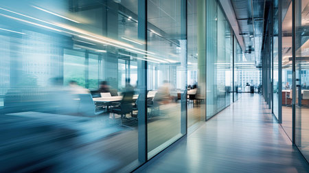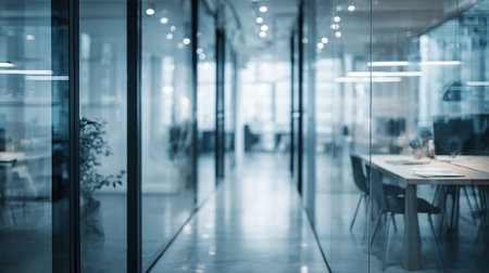 Modern Office Interior with Glass Walls, Corridor, and Defocused Bokeh Background in Blur