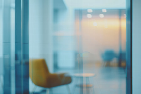The a blurred view of a modern office interior. The scene hanging lights creating a soft glow, glass partitions dividing the space, and large windows allowing natural light to flood in. The overall atmosphere is clean, minimal, and with a focus on contemporary The reflections on the glass and the soft blur give the an abstract and serene mood.