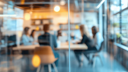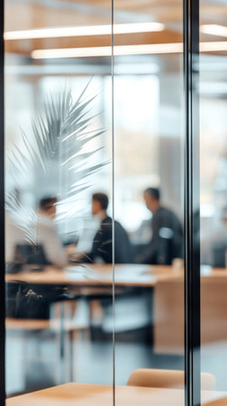 Blurred office workers sitting at desks in a modern workspace, seen through a glass partition with a decorative plant, creating a sense of privacy and focus