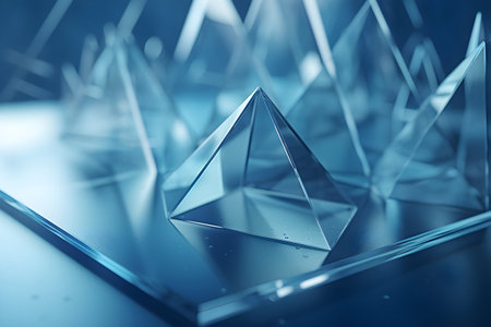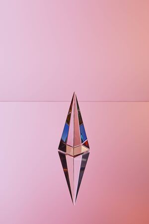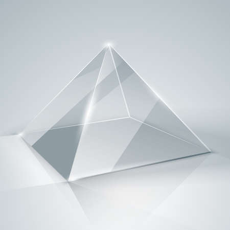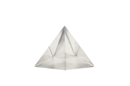 Shiny glass pyramid on a mirrored surface. Geomtric minimalist object.