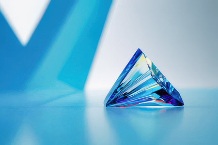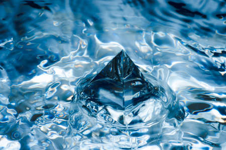 Abstract blue background with water splashen and a geometric object. Pyramid in water.