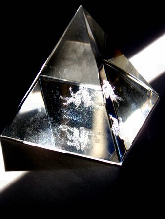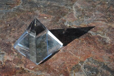 crystal transparent pyramid with light reflection on orange background, horizontal crop