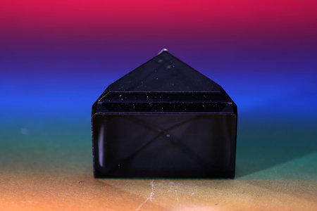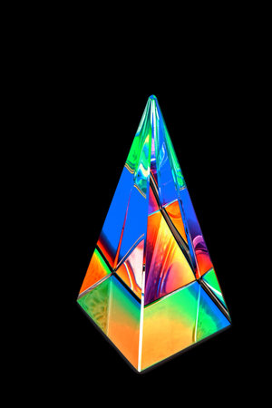 Glass pyramid prism with colorful light reflection on black background with copy space
