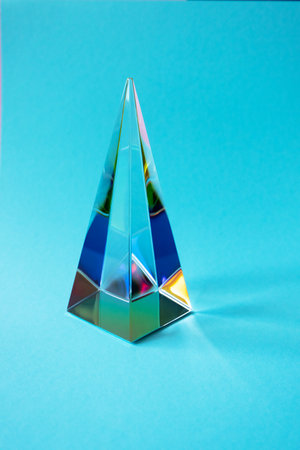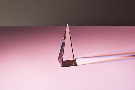 Glass pyramid prism with colorful sunlight reflection on background with copy space