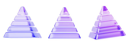 Glass holographic infographic pyramid 3d render icon set. Gradient five level triangle, information data hierarchy, chart or diagram for business presentation, marketing or financial