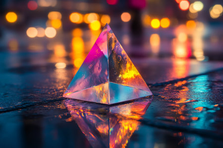 Crystal prism on wet surface reflecting city lights at twilight with vibrant warm and cool tones