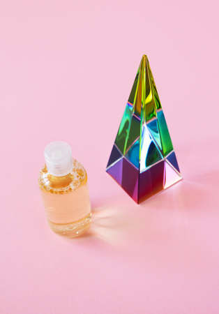 Hydrophilic cleanser oil mockup and glass pyramid prism on pink background with copy space, vertical. Makeup remover cosmetic product trendy minimalism