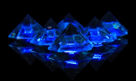 A close-up view of a cluster of shiny metallic pyramids with a bright light shining behind them