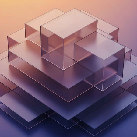 A 3D rendering of transparent purple and pink blocks stacked in a gradient background