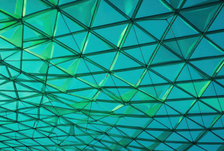 Low-angle view of a translucent, triangular-paneled glass ceiling with a blue-green tint