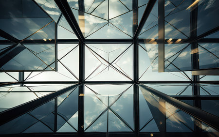 Modern glass ceiling with geometric patterns and skylight. The structure lets natural light into the building. High quality photo