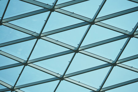 Abstract architectural glass ceiling with geometric steel frame against a bright blue sky