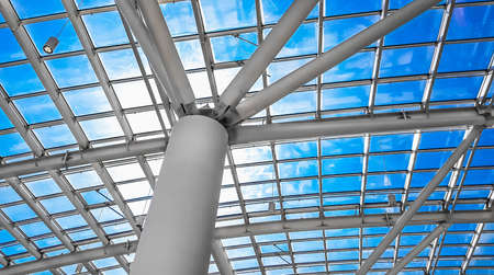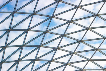 Geometric metal structure with glass, ceiling in a shopping center against the sky