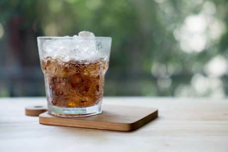 Refreshing black soda soft drinks with ice in a clear glass on wooden tabel