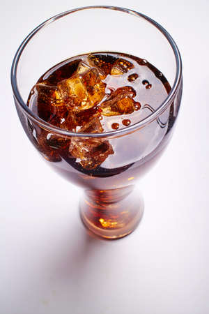 Photo of fizzy Cola in a glass with ice, isolated on a white background