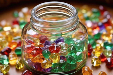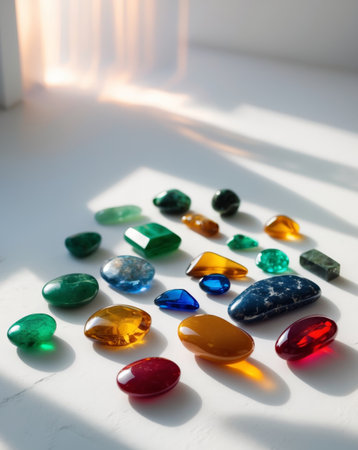 A captivating display of colorful gemstones spilling from a jar onto a shimmering surface, illuminated by soft natural light, showcasing their vibrant hues and sparkling clarity.