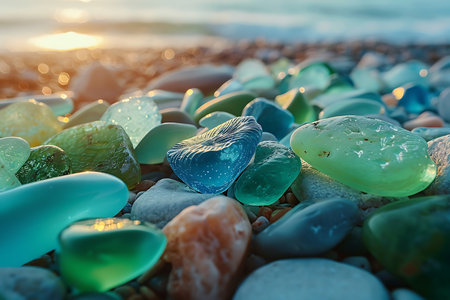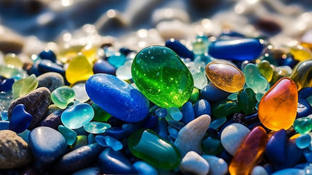 Colorful gemstones on a beach. Polish textured sea glass and stones on the seashore. Green, blue shiny glass with multi-colored sea pebbles close-up. Beach summer Ai generated