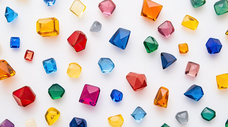 A vibrant collection of various geometric glass shapes in multiple colors on a clean white surface, perfect for design inspiration and creative projects.