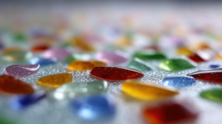 A stunning close-up of colorful glass pebbles scattered on a smooth surface, showcasing vibrant hues and intricate details ideal for background or artistic projects.