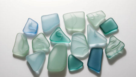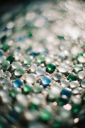 AI Generated. closeup of shiny sea glass pieces in pastel green and blue hues