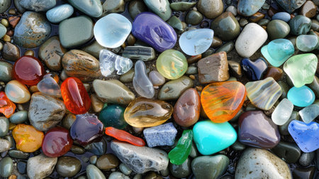 Shiny colorful stones on the beach shore, Colorful gemstones on a beach glowing, Ai generated
