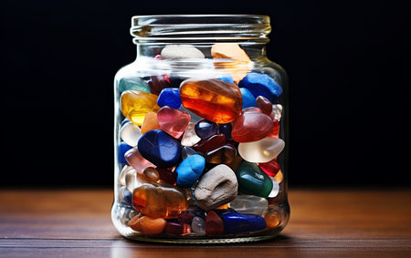 A captivating scene of colorful glass gems spilling from a vintage jar. The rich textures and natural light create a delightful display for creative inspiration.