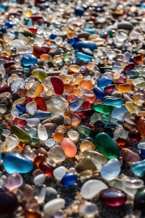 Colorful glass beach showcasing unique sea glass under sunlight by the shore