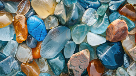 Colorful sea glass and natural pebbles forming a textured pattern background